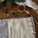Jetzt jeden Teigstreifen schlangenförmig zu einem Tannenbaum legen und auf einen Schaschlikspieß stecken. Obendrauf dann noch den Stern aufspießen.